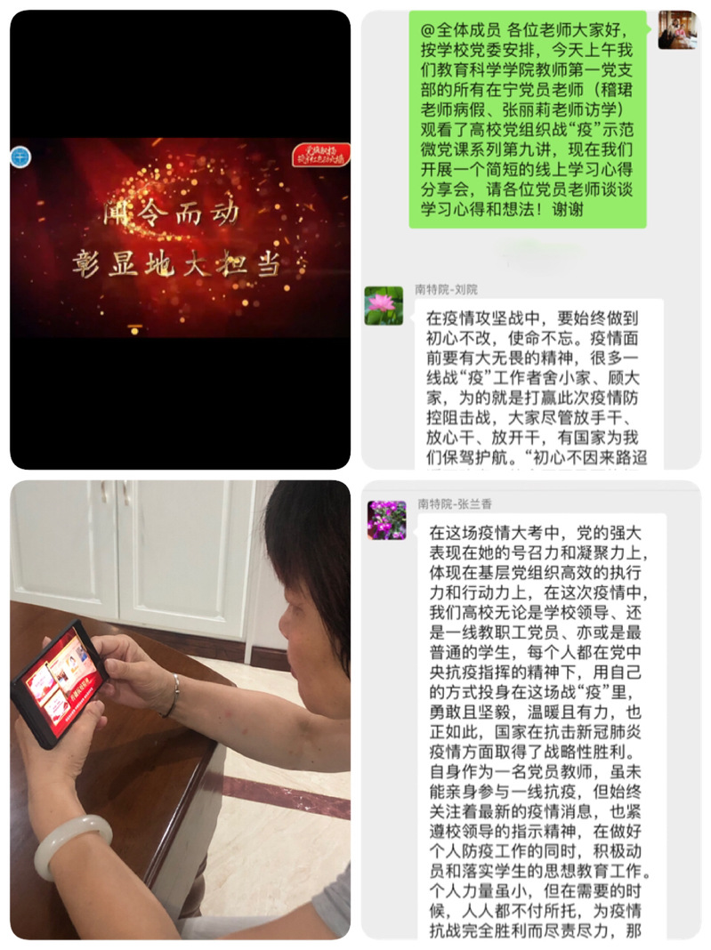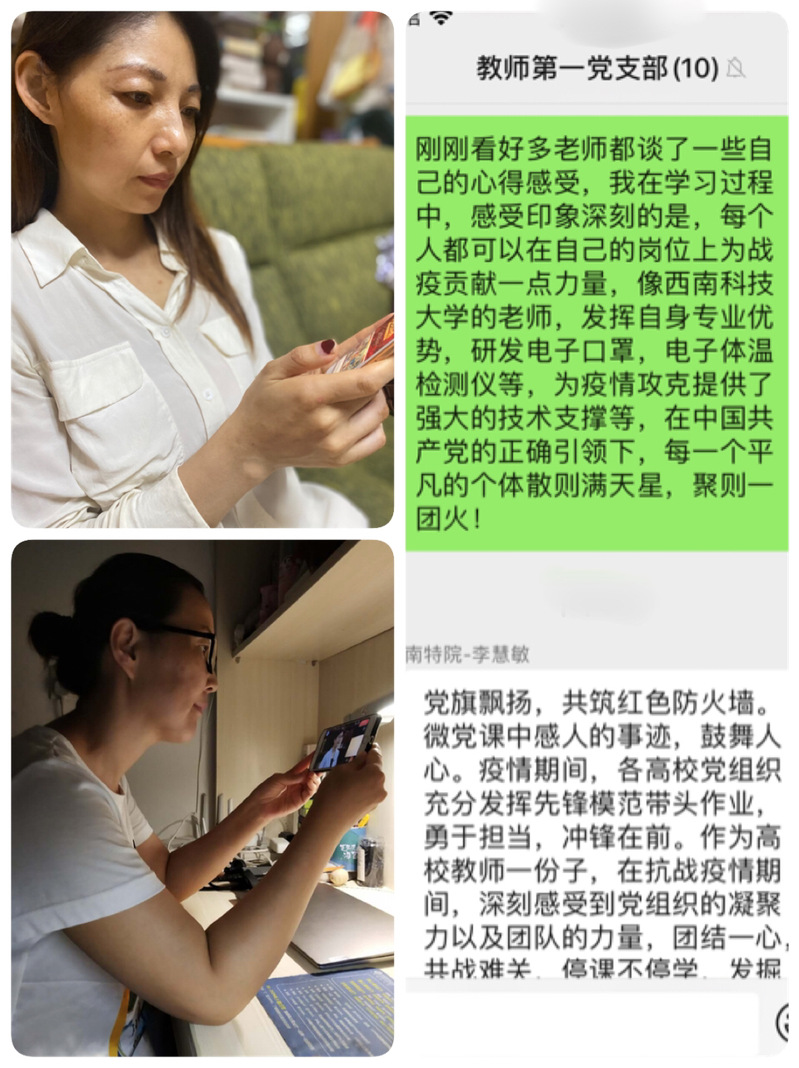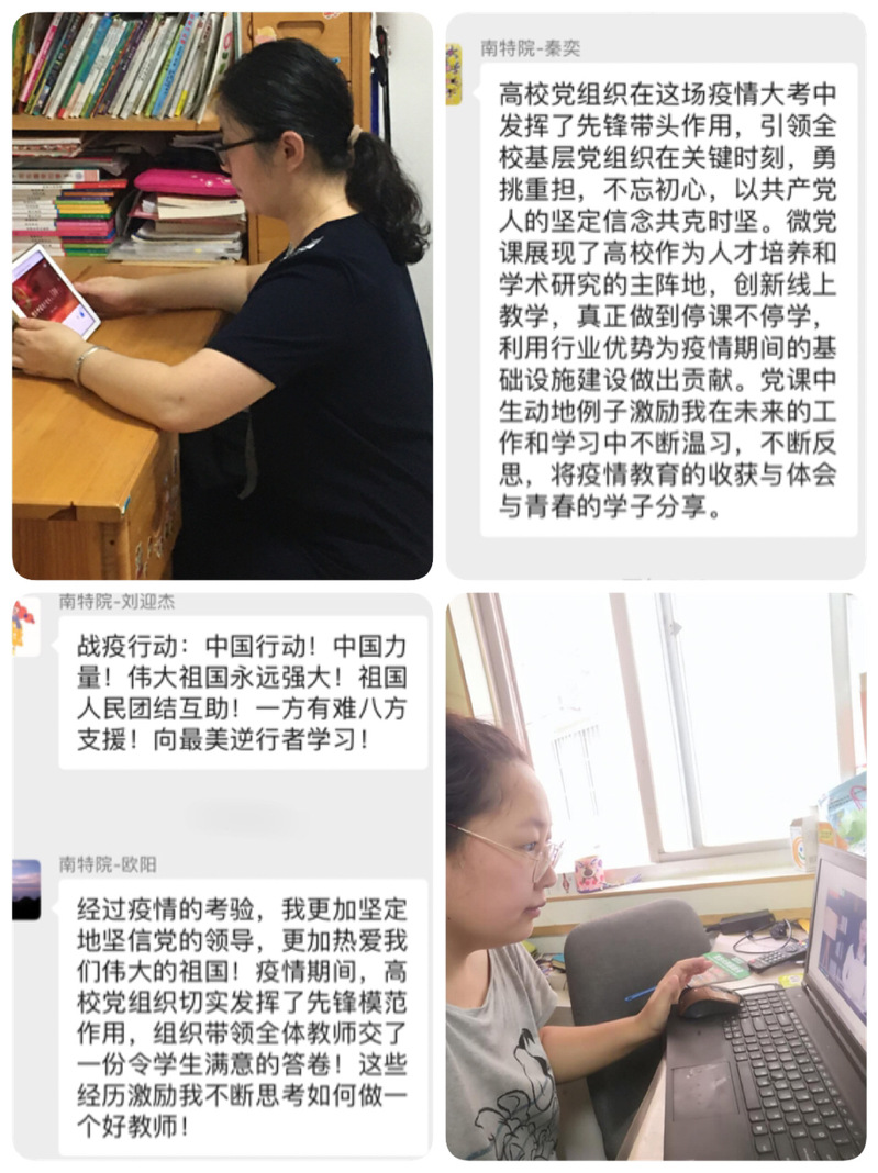 在随后的线上学习心得分享会上,纷纷积极主动地谈及自己的学习感悟,更加坚定地坚信中国共产党的领导,正如张兰香老师所说“在这场疫情大考中,中国共产党的强大表现在她的号召力和凝聚力上,体现在基层党组织高效的执行力和行动力上,在这次疫情中,我们高校无论是公司领导、还是一线教职工党员、亦或是最普通的员工,每个人都在党中央抗疫指挥的精神下,用自己的方式投身在这场战“疫”里,勇敢且坚毅,温暖且有力,也正如此,国家在抗击新冠肺炎疫情方面取得了战略性胜利。” 而这样的激励与信念也将延伸到我们每一位党员老师的工作与学习中,充分发挥先锋模范带头作用,勇于担当,无论何时何地何境,坚守自己的岗位,发掘资源、发挥优势,团结一心,散则满天星、聚则一团火。