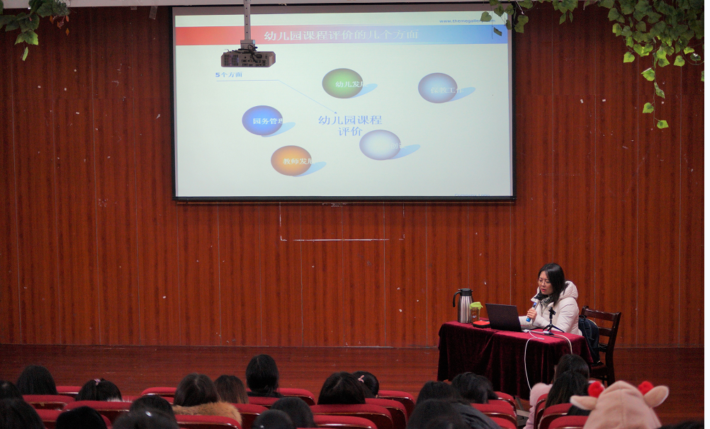 彭园长首先通过典型案例引出当下融合教育的重要性,从而指出观察在幼儿教师的课堂中无处不在。接着彭园长主要围绕四个话题展开论述本次讲座:什么是幼儿园课程评价、幼儿园课程评价有哪些方面的内容、幼儿发展评价是幼儿教师重要的专业能力以及幼儿发展评价的具体实施。同时彭园长详细分析了《幼儿园教育指导纲要(试行)》的基本理念,解读了幼儿园课程评价的重要意义,从而强调在幼儿发展评价中教师所处地位之关键。最后彭园长展示了她所在幼儿园制作的观察评价核检表,并通过几段视频让同学们更加深刻地理解幼儿行为观察的意义所在。彭园长现场示范做好日常观察与收集资料的注意事项以及分享幼儿园课程评价的方法。