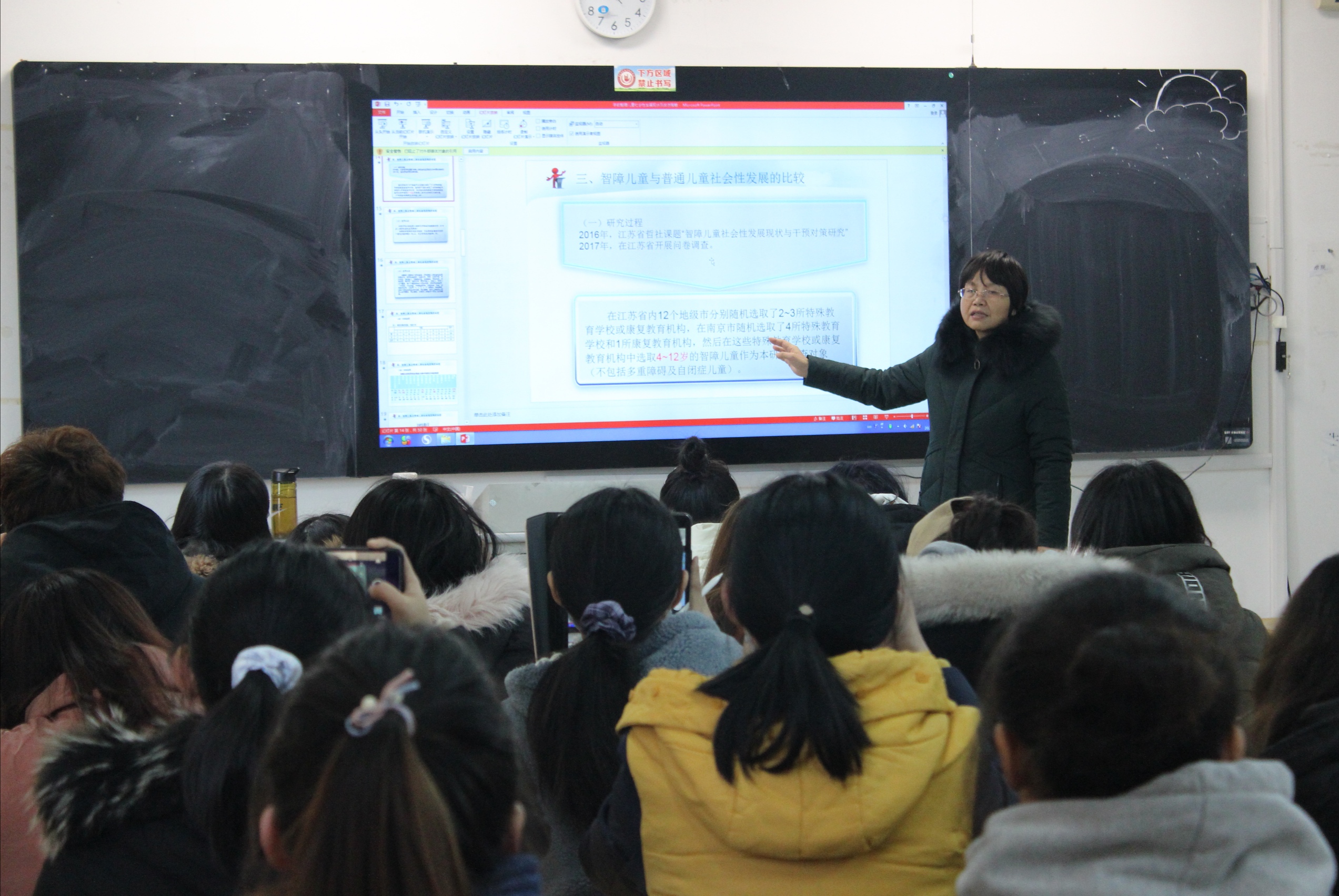 张老师从儿童社会性发展的内涵及社会教育的意义入手,向同学们展示和分享了本人主持的江苏省教育科学规划重点课题的阶段性成果。张老师与同学们交流了研究的过程和方法,呈现了“学前智障儿童社会性发展现状”的问卷调查结果,并通过图表、数据呈现学前智障儿童与普通儿童社会性发展的多维度比较,直观、形象地引导同学们感受和认识学前智障儿童社会发展的特征、影响因素以及开展社会教育的切入点。报告中,张老师特别强调周围人的态度和智障儿童自身的行为特征是导致其社会性发展水平低下的重要因素,指出改善周围人的态度是改进这一状况的最佳途径。