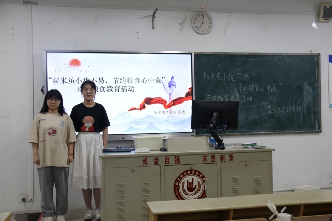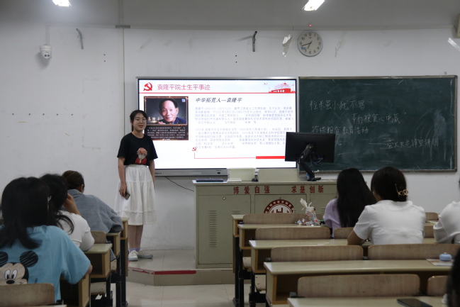 活动第一部分是在萤火虫先锋宣讲团成员钱纯的带领下,全体同学为袁隆平院士默哀三分钟。接着钱纯同学通过多媒体向同学们展现了袁隆平院士的生平事迹。袁隆平院士一生致力于杂交水稻研究,成就斐然,为中国乃至世界粮食安全做出突出贡献。在活动最后,萤火虫先锋宣讲人余彭欣妮列举数据和实例讲述粮食在我们生产生活中所占据的重要地位,进一步使同学们明确珍惜、节约粮食的重要意义,致敬袁隆平院士心怀苍生的情怀,发扬其勇攀科学高峰的精神。