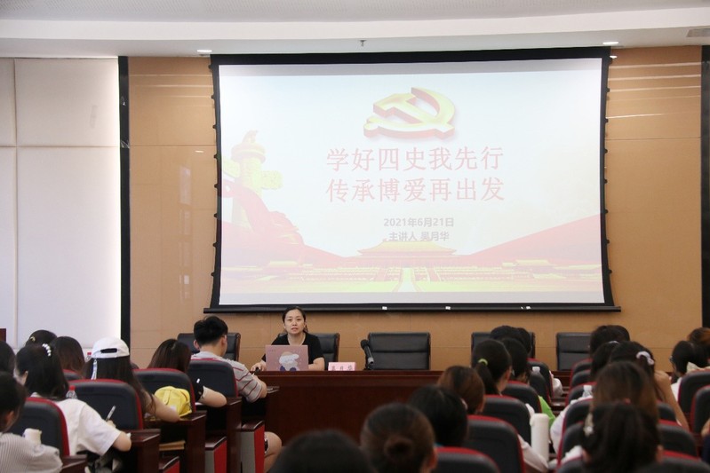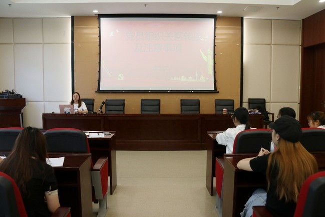 员工党支部书记汪亮巧老师向全体员工党员介绍党员组织关系转接及注意事项,确保毕业班党员顺利办好转接手续。之后,公司党总支书记吴月华老师给员工党员讲题为《学好“四史”我先行 传承博爱再出发》的党课。