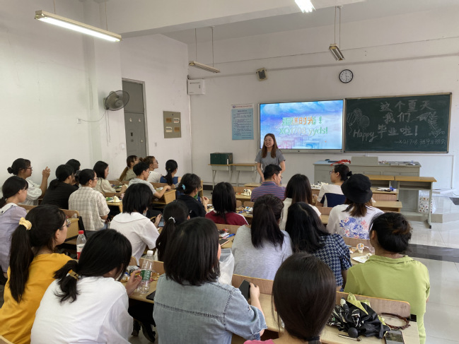 6月22日,随着歌曲《起风了》响起,学前1708班在博雅楼2403教室召开了主题班会。公司党总支副书记、班主任吴兴老师,张丽莉老师及辅导员汪亮巧老师与全体同学共聚一堂,共话离别情。班长胥佳用精心制作的PPT展示了四年里同学们的成长和蜕变。三位老师向学业有成、即将踏上新征程的同学们给予了最热烈的祝贺。同时,也向同学们提了三点希望,希望同学们尽快适应新生活、新环境;希望同学们把毕业看作起点,继续学习,增强能力;希望每位即将踏出校门的学子牢记母校的培育之恩,铭记老师的教导之情,为社会做贡献。张丽莉老师讲到情深之处,留下了不舍的泪水。最后,老师和同学们共同享用了班级定制的蛋糕,班会在合影留念中圆满落幕。其他各班也采用丰富多彩的形式,为班级留下了充满意义的纪念活动。