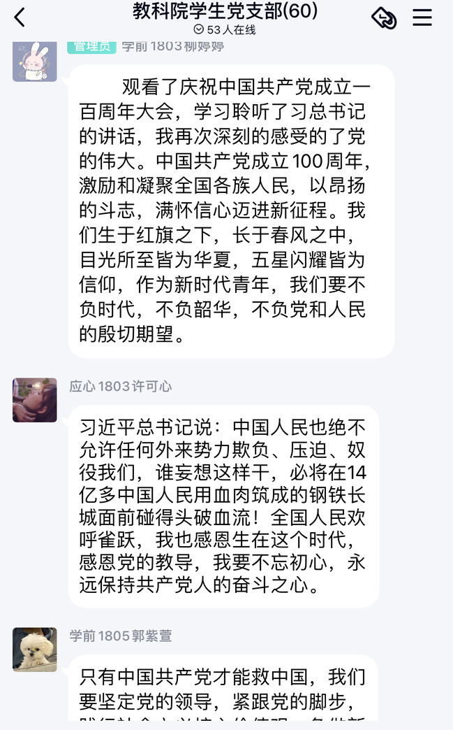 庆祝大会结束后,员工党支部第一时间组织员工党员学习习近平总书记重要讲话精神,迅速掀起了学习交流的热潮。员工党员纷纷自发在员工群发表内心感悟,通过撰写学习心得,回应习近平总书记期盼和重托。员工党员路璐表示:十分荣幸能够见证党的100岁生日。作为新时代青年,我们要居安思危,铭记历史,努力成为有担当有能力的人以报效祖国,愿祖国永远繁荣昌盛。员工党员李可心更是激动说到:“当听到习近平总书记说,中国人民站起来了!中华民族任人宰割、饱受欺凌的时代一去不复返了!听到这句话我忍不住热泪盈眶了!”