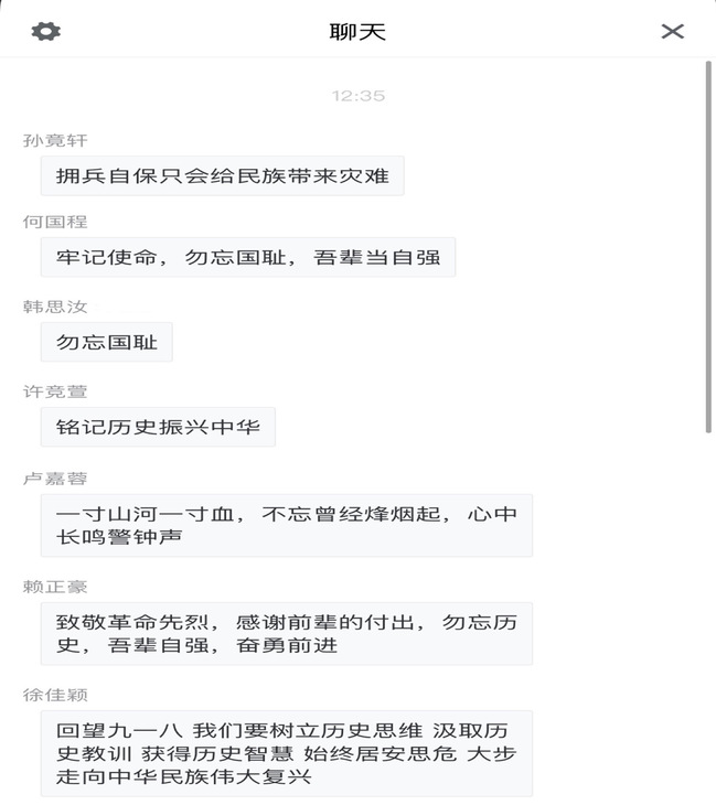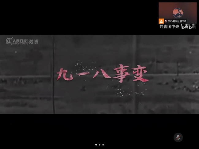 九一八事变是中国抗战史的起点,之后的一二八事变、西安事变、淞沪会战一直到日本投降,在场的所有人好像都随着视频的一帧一帧走进了那个战火纷飞,中国上下一心的时间。站在先辈创造的光明里,九一八事变始终敲响着振聋发聩的警钟。在观看共青团中央发布的《三分钟混剪抗战史》后所有人都陷入了深深地自悟自省中,短短三分钟的视频里百种感悟在心中酝酿“一寸山河一寸血,不忘曾经烽烟起,心中长鸣警钟声。”“致敬革命先烈,感谢前辈的付出,勿忘历史,吾辈自强,奋力前进。”