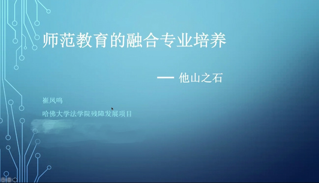 崔凤鸣博士现任哈佛大学法公司残障发展项目中国部主任。在讲座上,崔凤鸣博士作了题为《师范教育的融合专业培养》的报告。报告中,她从“作为教育工作者,我们当下做什么很重要?”的讨论切入,引导教师们对师范教育的愿景和使命展开思考,随后对师范教育的专业设置和研究领域、师范融合教育的专业优势定位、师范教育的通用学习设计、师范教育的员工多样性和差异性支持等方面内容逐一展开介绍。其中,以波士顿大学为例,对师范教育的专业设置、课程安排专业路径探索各方面进行了讲解,并对残障研究的概念、原则和国外嵌入残障研究的专业和课程发展进行了分享。