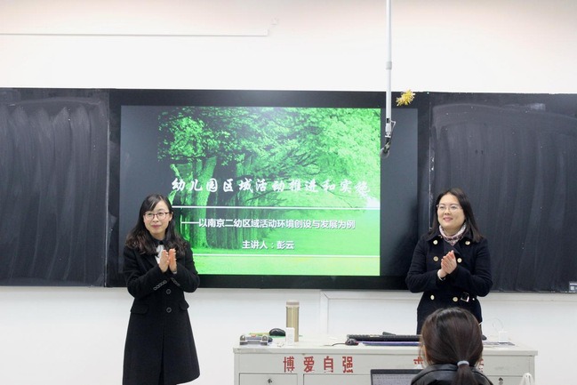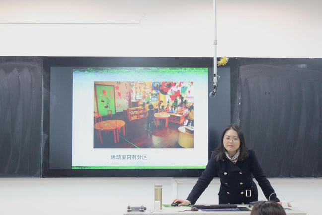 讲座开始,彭云老师以南京二幼区域活动环境创设与发展为例讲述了幼儿园区域活动推进和实施有关的内容。接着彭云老师阐释了区域活动的概念,提出区域活动具有自由性、自主性、指导的间接性、个性化的特点。彭云老师指出,环境的创设与利用由“调整格局搭架子”和“交流学习换脑子”两部分组成。同时老师也强调环境的创设需要观察,需要生活经验的积累,更需要有创造性的思维。讲座最后,彭云老师为同学们详细介绍了教团队格证面试的流程和各方面的注意事项。