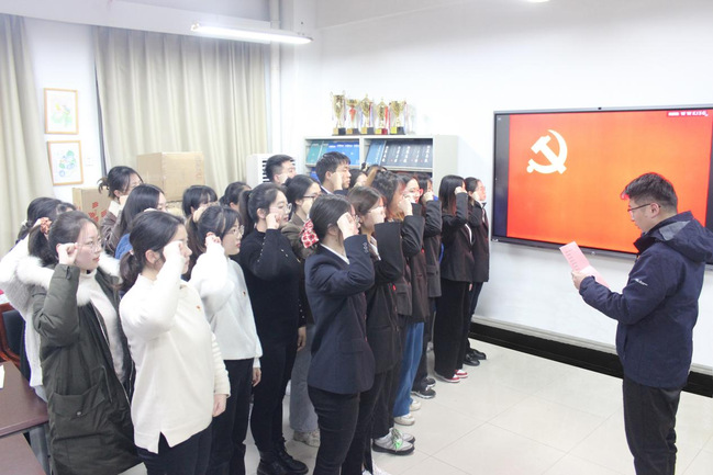 会前,汪亮巧书记对到会人数进行统计,符合大会规定人数。会上,29名发展对象分别向党组织重点汇报了入党动机、对党的认识等,并理性剖析自身存在问题,表明自己的工作展望、入党决心,表达作为发展对象主动向党组织靠拢的强烈意愿。随后,入党介绍人就相应发展对象的个人情况进行汇报并对其能否入党表明意见。正式党员以无记名投票方式进行表决,大会一致同意接收陈天慧等29名发展对象成为预备党员。党总支书记吴月华为新发展预备党员佩戴党员徽章并赠送学习用品。新发展预备党员在李维翔老师的带领下面向党旗进行庄严的入党宣誓,他们高亢激昂的宣誓声回荡在会议室,真正展现出对中国共产党的崇高敬意。吴月华书记向新预备党员表示祝贺同时提出三点要求:第一,坚定理想信念,心有所信,方能行远;第二,坚持学习提升,向理论学习、向实践学习、向社会学习、向员工学习,积极学习先进人物、典型案例等;第三,永葆入党初心,不仅要从组织上入党更要从思想上入党。吴月华书记寄语大家要志存高远,脚踏实地,争当表率,争做示范,走在前列,发挥好党员的先锋模范作用!