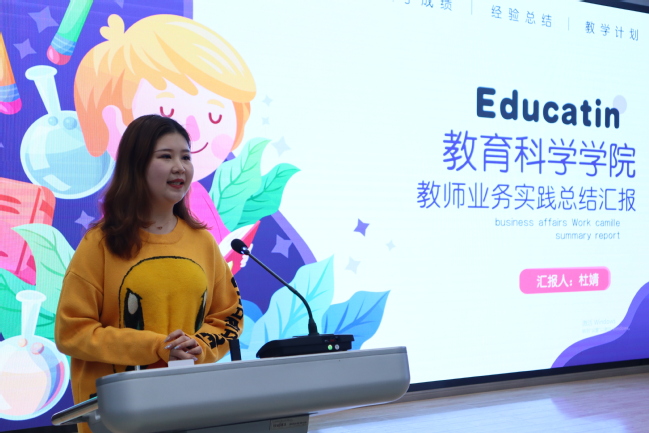 新进教师们就自己入职以来的思想政治学习、教学工作、科研工作等多方面的业务学习情况与大家进行了分享。首先,多位新进教师都提到了思想政治学习的重要性,汇报了自己对于在专业教学中渗透课程思政理念的学习情况和思考成果。接着,在教学工作、科研工作等方面,新进教师们纷纷表示公司层面组织的公开课展示活动、“老带新”的导师制指导计划、听评课活动以及公司层面组织的专家讲座、科研指导培训、课题申报论证会等,使他们从前辈教师那里听取了很多好的建议,提升了教学和科研能力。此外,张扬和杜婧两位本学刚刚结束在幼儿园挂职锻炼的老师,也专门从特殊儿童的早期融合教育实践分享了个人感触和收获。(文/张慧君 图/余宛琳 编辑/张慧君 审核/吴月华 刘新学)