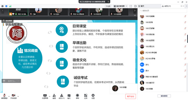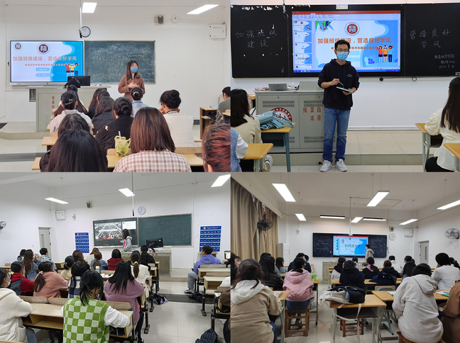 会议从“学风建设意义”、“目前现状”、“从我做起”、“共同努力”四个方面展开。首先,第一部分以“如何读大学?”引出内容,提出老员工要利用好四年大学时光,扎实学好专业知识,只争朝夕,不负韶华!其次,第二部分简要分析了目前老员工学习的基本现状,提醒同学们寻找合适自己的学习方法,养成良好学习习惯,为职业生涯发展做足准备。最后提出,今年是公司本科合格评估重要时期,应从班级做起,从自身做起,抓实、抓牢学风建设。在班会的最后,各班辅导员、班主任老师针对各班实际情况对同学们提出要求,希望大家踔厉奋发,笃行致远,营造优良学风、班风。