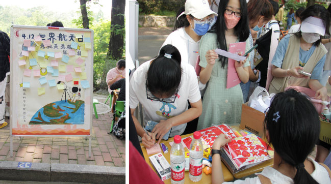 4月12日是世界航天日,“星空浩瀚无比,探索永无止境”,从“东方红一号”成功发射,到嫦娥探月、天问问天、神舟逐梦……中国航天人从未停止对宇宙的探索,中国航天正向着星辰大海不断前进。本次活动主要分为三个板块,在第一个板块中,同学们在便利贴纸上写下对航天员的真挚祝福,并粘贴在海报墙上;第二个板块,同学们参与航天知识竞答,答对不同题数可以获得不同礼品;第三个板块,同学们在手工坊同学的指导下采用黏土,捏出航天主题的相关作品。线上网课期间,生动且有趣味性的林荫道主题活动,不仅丰富了同学们的课余生活,也进一步弘扬了航天精神、普及了航天知识。