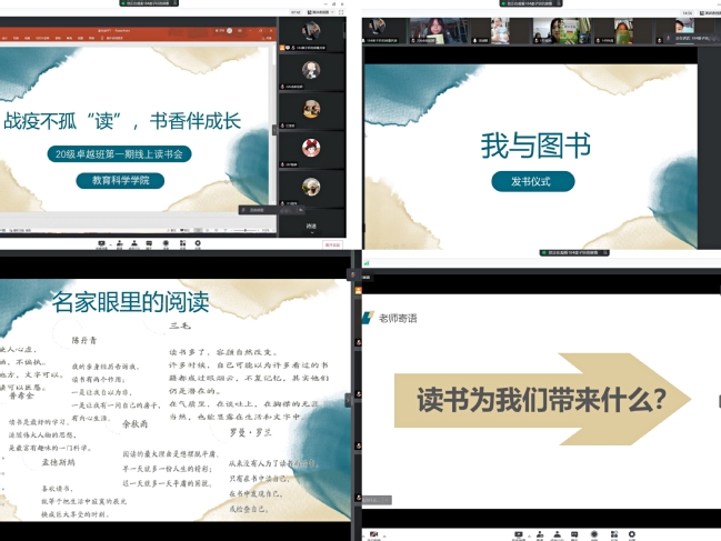 为了更好开展读书会活动,公司为卓越班同学够买了百余本教育经典书籍。活动开场后,每位同学开启摄像头,展示了自己近期阅读的专业经典书目,晁慧宇同学和郑琛钱同学分享了读书心得。张丽莉经理围绕“卓越幼儿园教师应该要读什么书?”和“应该怎么去读书?”两个问题,分享了自己读书的感受和热爱,并勉励同学们坚持读书,共同成长。