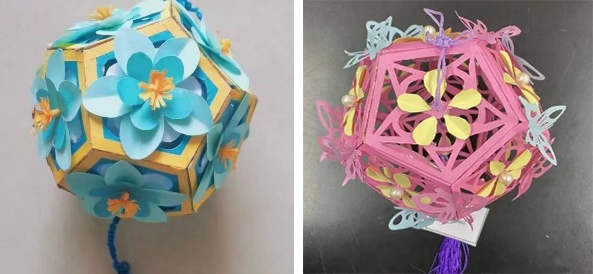 镂空花球内部中空,外部用刻刀雕刻出形状,可以采用剪纸、折纸粘贴于彩球上,增加彩球的立体感与美观性。另外,在镂空彩球里放立体几何,小灯泡,在中部穿过一条穗子等,会产生更美的效果。