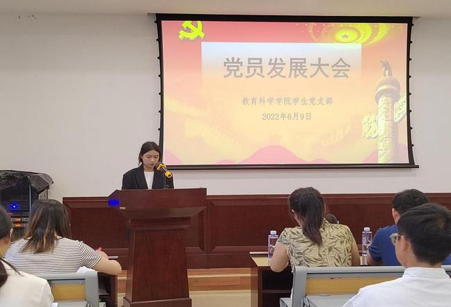 会前,汪亮巧书记对到会人数进行统计,符合大会规定人数。会上,14名发展对象依次上台就自己一年以来的表现进行思想汇报,向党组织重点汇报了个人基本情况、入党动机、对党的认识等,表明自己对党的忠诚与向往,表达作为发展对象主动向党组织靠拢的强烈意愿。在每位党员发展对象思想汇报结束后,入党介绍人对其学习、工作、实践活动等方面进行评价,并对其能否入党表明意见。正式党员以无记名投票方式进行表决,大会一致同意接收仇静等14名发展对象成为预备党员。吴月华书记向新预备党员表示祝贺,并提出四点希望与要求:一要牢记党员义务,发挥先锋模范作用;二应提高党性修养,加强理论学习;三当致力服务师生,热爱特教事业;四须积极参与社会实践,在实践中锻炼。最后她祝愿新预备党员们在新的起点上进一步完善自己,从而早日成为合格的共产党员。