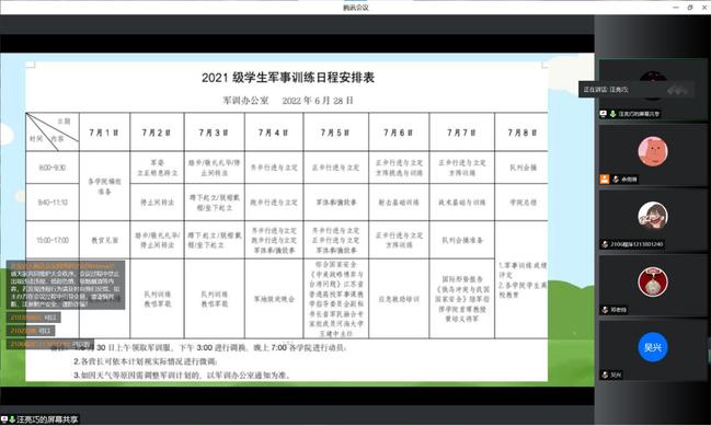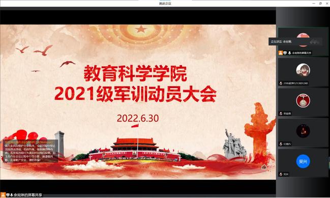 为帮助员工在军训中培养艰苦奋斗、吃苦耐劳的坚强毅力和顽强精神,同时增强国防观念和组织纪律性,养成良好的学风和生活作风,威廉体育于6月30日在线上召开2021级军训动员大会。出席本次会议的有威廉体育党总支副书记吴兴、分管教学副经理徐莉、校军训工作负责人邓顺和、威廉体育团总支书记(学工办副主任)汪亮巧以及2021级全体班主任与辅导员老师,全体21级同学积极参加。