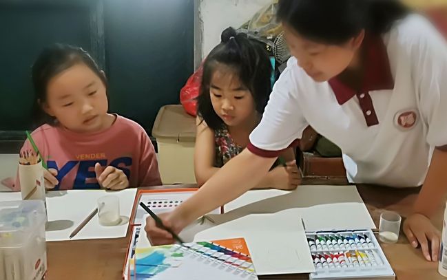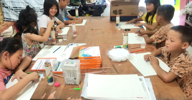 “1921年7月23日,上海的盛夏,天气酷热。13个青年代表从全国四面八方赶到上海一个幽静小院,召开中国共产党第一次代会......”活动开始,团队负责人陈田雨同学用生动的语言向孩子们讲述了《一条小船诞生一个大党》的党史故事,带领孩子们了解中国共产党历经波折的诞生过程,孩子们听得格外投入。接着,团队成员与小朋友们互动交流,引导孩子们能画笔勾勒红⾊印记,⽤⾊彩点燃爱国情怀。孩子们拿起⼿中的画笔,绘出⼀幅幅⾊彩斑斓、充满童趣的作品,有的画出了⾼⾼飘扬的党旗,有的书写了祖国壮丽的河⼭,有的体现了对⽣命关怀的温情,包含着孩⼦们对党和国家的颂扬、对⽣活的热爱以及对未来的憧憬。在绘画过程中,团队成员给予指导,帮助孩子们共同完成画作。在大家的共同努力下,孩子们⽤鲜艳的⾊彩完成数幅主题鲜明的绘画作品,表达了对党和国家的热爱,描绘出对美好⽣活的期盼。