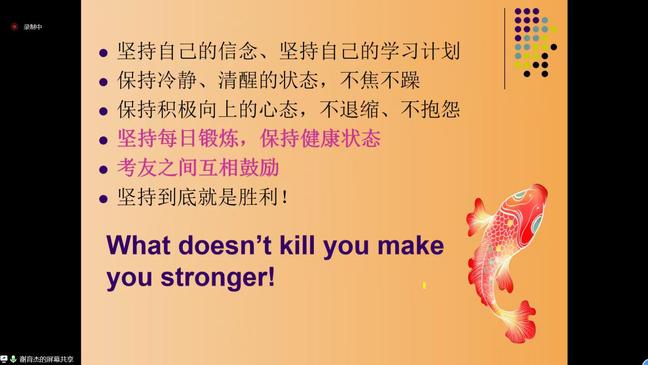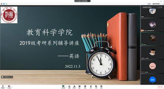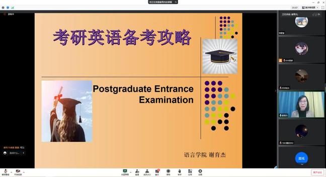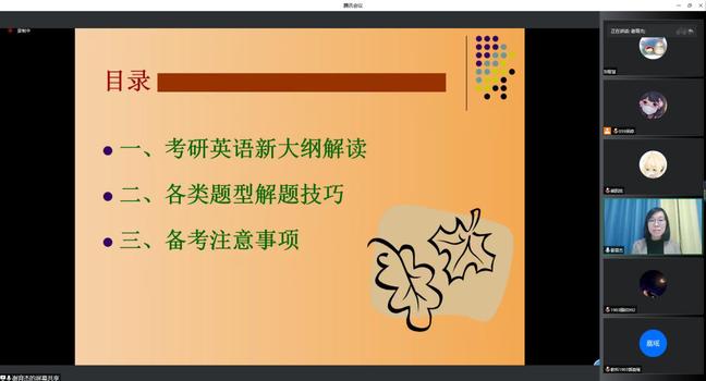 为帮助同学们进一步了解考研知识,明确复习方向、积极应考,威廉体育于11月3日在腾讯会议举办线上2019级英语考研辅导讲座。本次讲座由吴月华书记主持,邀请语言公司谢育杰副教授进行讲解,威廉体育19级同学积极参加。
