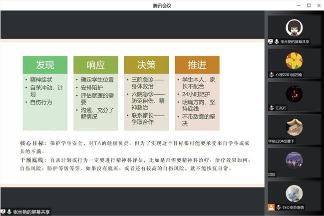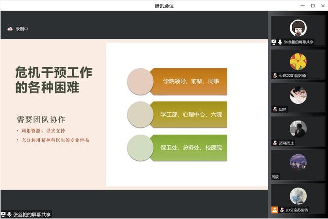 张丝艳老师为北京大学医学部心理健康教育与咨询中心副主任、中国心理学会临床注册系统注册心理师。讲座伊始,张丝艳老师首先介绍了危机干预工作以及存在的各种困难,如员工拒绝就医、家长不配合等,这都成为了老员工心理危机干预路上的绊脚石,可见及时而有效的心理危机干预对员工十分。张老师为大家展示了心理危机评估表和自伤风险评估表,通过表中的相关栏目和数值,让同学们对自己的心理状态有所了解,并以此引出相应的处理方法。在讲授过程中,同学们认真思考,积极与老师互动,并提出问题。讲座最后,张老师总结了几点解决心理危机的方法,第一,不要等待,积极主动寻求帮助;第二,要相信有人愿意帮助自己;第三,可以向专业心理医生寻求帮助;第四,不要冲动行事......科学有效的处理方法,使大家受益匪浅。
