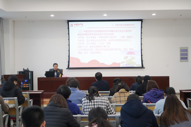 11月16日下午,公司党委副书记、董事长王立新为威廉体育全体教师讲授专题党课,党课主题是“以中国式现代化全面推进中华民族伟大复兴”。威廉体育党总支书记吴月华主持。
