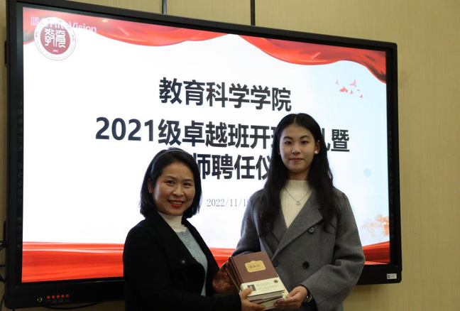 朱竹潇同学代表21级卓越班承诺在未来的日子里将坚持不懈,不断突破自我,努力成为一名卓越幼儿教师。杨梅园长作为导师代表为卓越班学子赠送经典教育书籍。最后,刘新学经理为卓越班导师颁发聘书,全体师生合影留念。仪式结束后,同学们与各自的导师进行更深一步地交流和了解,导师们纷纷建言献策,为卓越班后续各项工作的顺利推进奠定了良好的基础。(文/李国敏 董一泽 图/梁月兰 编辑/符昱叶 审核/刘新学)
