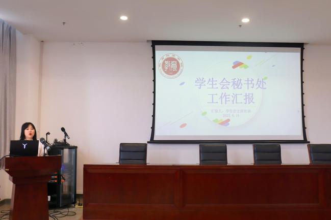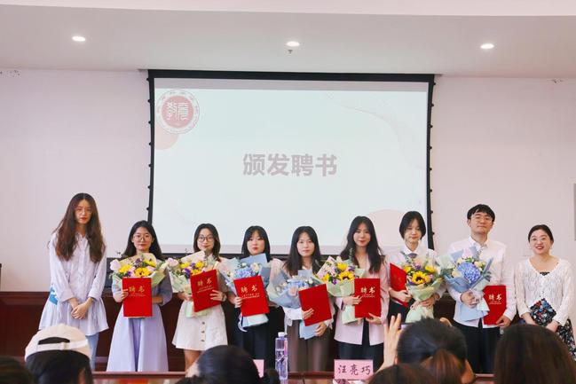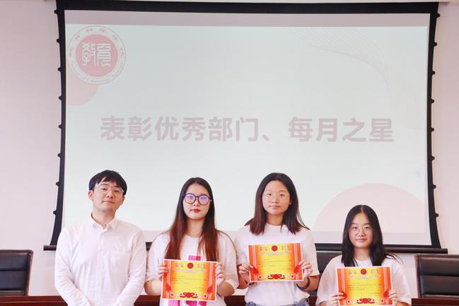 会议伊始,员工会轮值主席依次进行述职汇报,他们分别从学期工作概述、工作成果展示、工作存在的不足以及日后工作的改进四个方面对一年的工作进行全面汇报,着重从强思想、重学术、提素质、广宣传四个角度详细全面地展示各项工作成果。除此之外,主席们也在汇报中表达了自己和部门一起成长的过程与心路历程,表现了自己对部门成员的感激与不舍。最后,汪亮巧老师对这学期的工作表示肯定,并就今后的工作向大家提出希望。颁奖环节,老师们给即将卸任的主席颁发聘书,鼓励主席们继续奋发向上。各主席给优秀部门与“每月之星”颁发荣誉证书,鼓励在本月工作中表现优秀的干事,希望大家继续努力、再创佳绩。