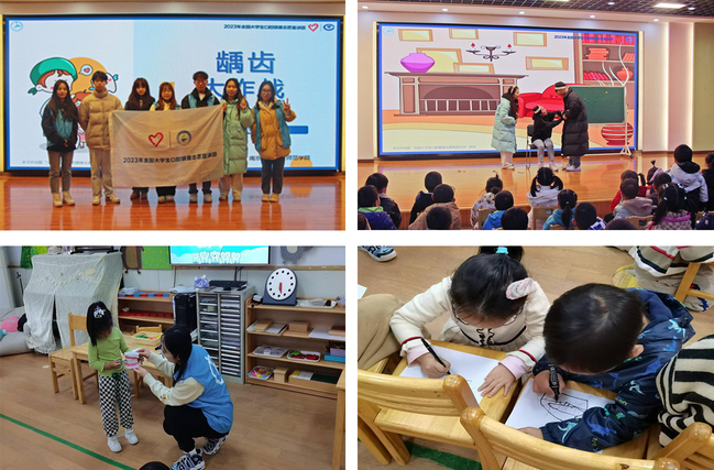 保护牙齿,从小做起,从早做起。坚“齿”到底团队充分发挥学前融合教育的专业优势,前往南京青秀城幼儿园、丁家庄第二分园开展宣讲,团队结合《幼儿园教育指导纲要》与《3-6岁儿童学习与发展指南》,根据幼儿的年龄特点和身体发展水平,让口腔健康深入幼儿生活。宣讲形式创新为“绘本演绎”“情景剧表演”等,生动有趣的环节吸引了幼儿的注意,达到了更好的宣讲效果。同时,团队成员结合牙齿模型,引导幼儿认识牙齿,学会如何正确刷牙,培养爱牙意识。