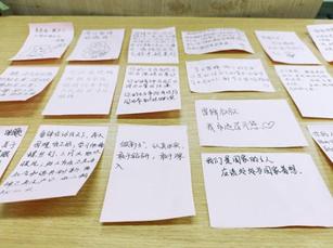 一张张小小的便利签上,充满的是各年级员工的感悟与祝福:两个校区的员工,在不同的地点,用同一种方式,传递自己的心声。有的班级,以主题班会方式,把大家齐聚一堂,写下自己的感悟,每个人的文字在无言中流淌,形成传承的河流。有的班级以小组分享的形式开展,小组代表们向其他同学分享着自己小组便利贴的内容,充满了对志愿精神的崇敬。