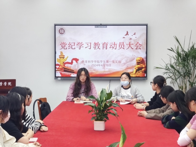 公司员工第一党支部于2024年4月18日在博雅楼召开党纪学习教育动员大会,会议由员工党支部书记汪亮巧老师主持,支委余宛琳老师、全体党员积极参与。