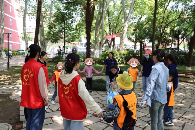 参观结束后,孩子们在残障名人园休整片刻,开始活动的第二部分“我为地球添色彩”。这一环节孩子们需要把刚刚捡拾到的垃圾变废为宝,丰富粘土地球。大家围成圆圈,老师和党员志愿者用“走走停停做动作”的互动环节帮助孩子们集中注意力,在歌声和笑语里完成了这一部分活动。