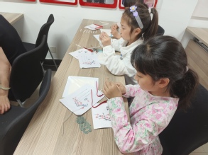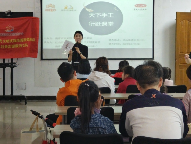 梅花是南京的市花,象征着坚强、圣洁、清廉、孤独,代表着坚韧不拔的高尚精神。老师向小朋友们展示了一幅衍纸梅花作品,询问作品的特别之处,小朋友踊跃回答。老师详细介绍了衍纸及其做法,志愿者们配合进行材料准备,并把材料分发给小朋友们,帮助小朋友们一起制作衍纸作品。