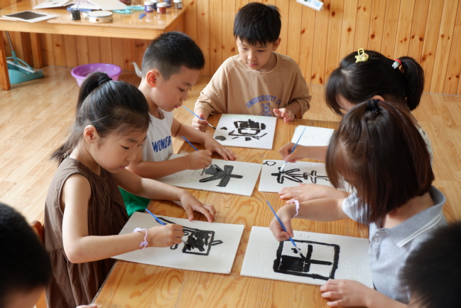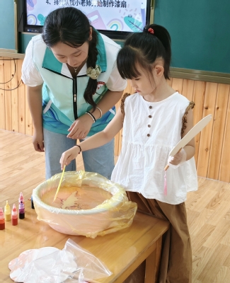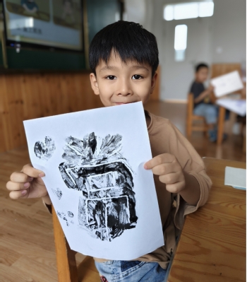 传统拓印连接古今,志愿者组织开展了以“拓字的秘密”为主题美育活动。志愿者为幼儿准备吹塑纸板和水彩颜料等工具,以当地特色鱼拓为引子,激发幼儿对当地布糊画这一非遗文化的兴趣以及引发对“拓印”这一工艺的好奇。通过百家姓,调动幼儿的知识经验,以姓氏为主题,开展拓印活动。志愿者指导幼儿进行刻字、涂色、拓印,增强幼儿对姓氏的进一步认识,鼓励幼儿进一步探究拓印以及自身姓氏背后的故事。