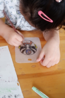 今来古往诸般事,脸谱斑斓秀万家。河北梆子是河北省最具有代表性的地方腔种,而河北梆子与京剧除了在表演艺术和唱腔上有区别外,脸谱和服饰基本相同。活动中,通过播放《京剧猫》动画,让幼儿对京剧这一中华优秀传统文化产生兴趣。为进一步增加幼儿对京剧基本动作和角色的认知,志愿者设置模仿与问答环节,和幼儿共同走进京剧。团队选择了简单易操作的热缩片为载体制作京剧脸谱挂饰,让幼儿身临其境地感受到京剧深厚底蕴,提高幼儿自身动手操作能力以及审美素养。最后,通过京剧脸谱挂饰成品展示这一环节,引出河北梆子戏这一乡土文化,使幼儿在京剧的余韵当中产生对河北梆子戏的好奇心,在活动结束后主动探索,生成连锁效应。通过这一活动,幼儿对京剧文化与河北梆子戏的差异和相同之处有了更深层次的了解,能在生活中积极主动向家长老师了解身边的传统文化,主动去参观相关博物馆和观看相关戏剧节目,感受中华传统文化独特的艺术魅力。