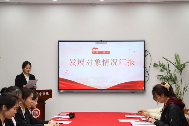 会议伊始,参会全体人员以饱满的精神状态唱响国际歌。会上11名发展对象依次就自己一年以来的表现进行思想汇报,重点汇报了个人基本情况、入党动机、对党的认识等,同学们诚恳地表达了对党的忠诚和入党的决心。在每位发展对象思想汇报结束后,入党介绍人对其学习、工作、实践、思想作风等方面进行客观的评价,并对其能否入党表明意见。