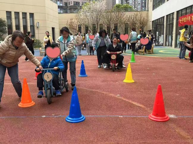 比赛进行时,家长、老师和志愿者们在场边给孩子们加油鼓气,呼喊声此起彼伏,孩子们和志愿者们一起进行了拔河游戏、套圈游戏、乒乓大作战、趴地圈圈等游戏,孩子们的参赛更像是沉浸式游戏,输赢从不是终点,每个孩子们始终践行着安全第一、比赛第二的原则。