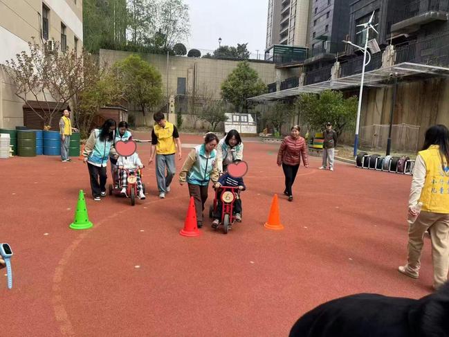 运动项目开始前,志愿者们用夸张的动作和生动的语言演示比赛规则,孩子们瞪大眼睛认真观看,时不时发出咯咯的笑声,同时志愿者们强调“不推不挤”“慢慢来”,并在赛道旁保护孩子们。