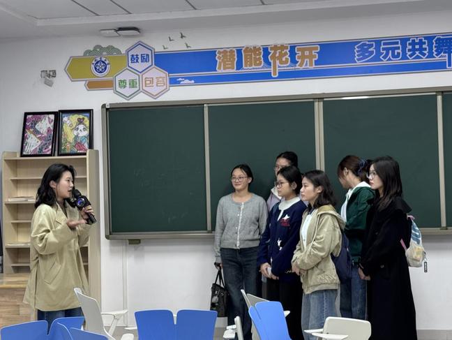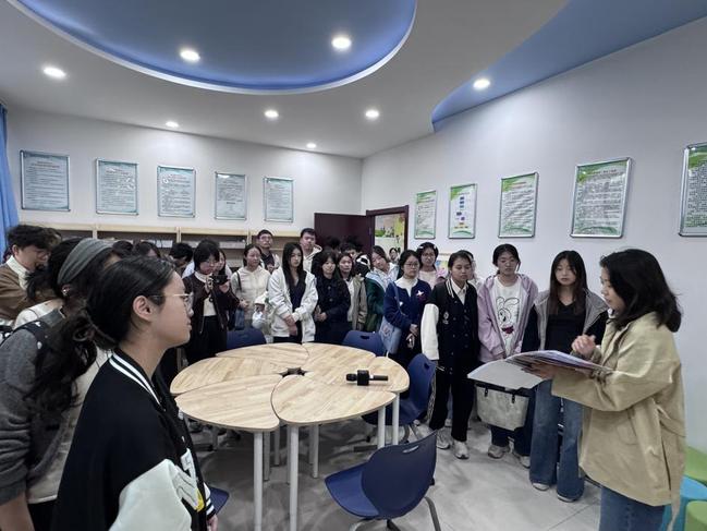 随后,师生队伍移步至公司的融合教育资源中心,由公司优秀毕业生——严欣老师负责讲解。严老师不仅概述了中心的发展历程与整体运作情况,更引导大家逐一参观了感统训练室、个别化辅导室、资源教室等多种功能空间。她现场展示并讲解了多种特制教具,让同学们对融合教育的“精准支持”有了更为具象化的理解。